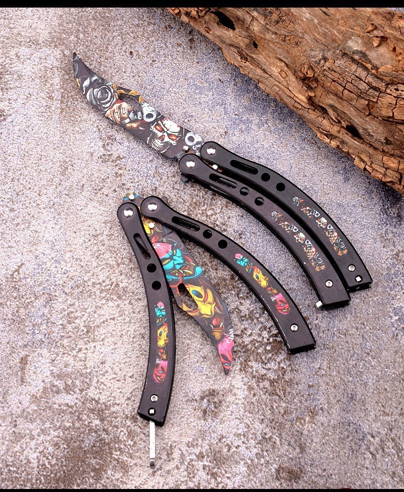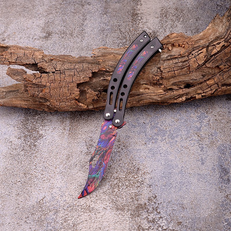 Perfect your flipping moves in style with our CSGO Butterfly Knife Trainer or use for martial arts performances. Either way, you’ll look great using this colorful trainer. It has a 4 1/4” stainless steel trainer blade with a photography quality impeccable design. The handles are of stainless steel with resin inserts to match the blade. The colorful butterfly trainer is 9 1/2” in overall length, 6” when closed and it has a secure handle locking mechanism.